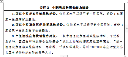 3.提升應對突發(fā)公共衛(wèi)生事件的支撐保障能力。加強中醫(yī)藥應急物資、設施設備和技術資源儲備,支持省級中醫(yī)醫(yī)院建設中藥材和中成藥戰(zhàn)略儲備基地;支持有條件的中醫(yī)醫(yī)院根據“平急結合、中西醫(yī)并重”的原則,建立省級公共衛(wèi)生基地;加強中醫(yī)疫病防治隊伍和緊急醫(yī)學救援隊伍建設,建立中醫(yī)藥應對重大公共衛(wèi)生事件和疫病防治骨干人才庫。