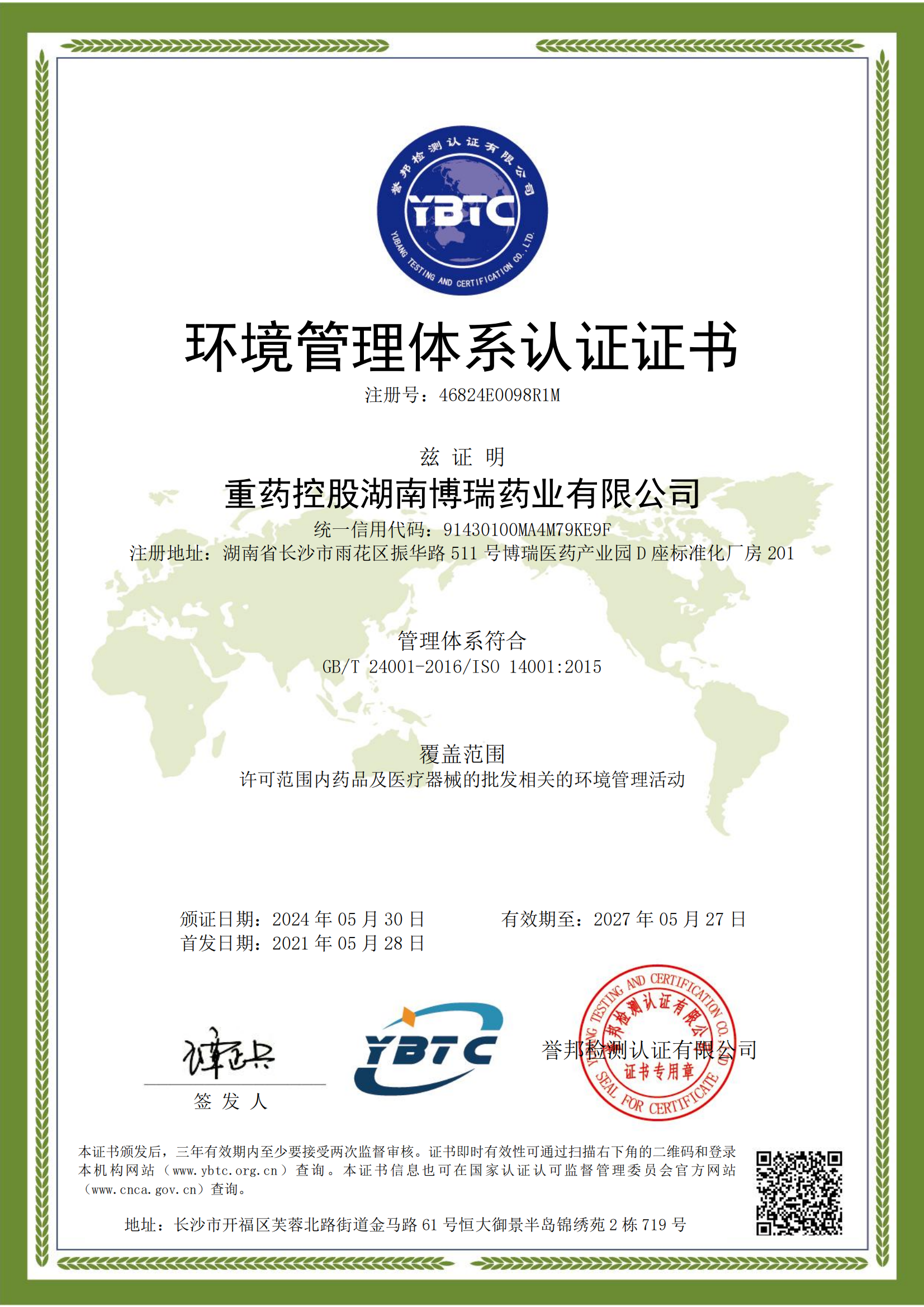 同時,尊龍凱時人生就是搏控股湖南博瑞藥業還通過了GB/T 45001-2020/ISO 45001:2018職業健康安全管理體系認證、GB/T 24001-2016/ISO 14001:2015環境安全管理體系認證,GB/T 19001-2016/ISO 9001:2015質量管理體系認證,這標志著我司在質量管理、職業健康及環境管理方面的卓越表現再次獲得國際認可。