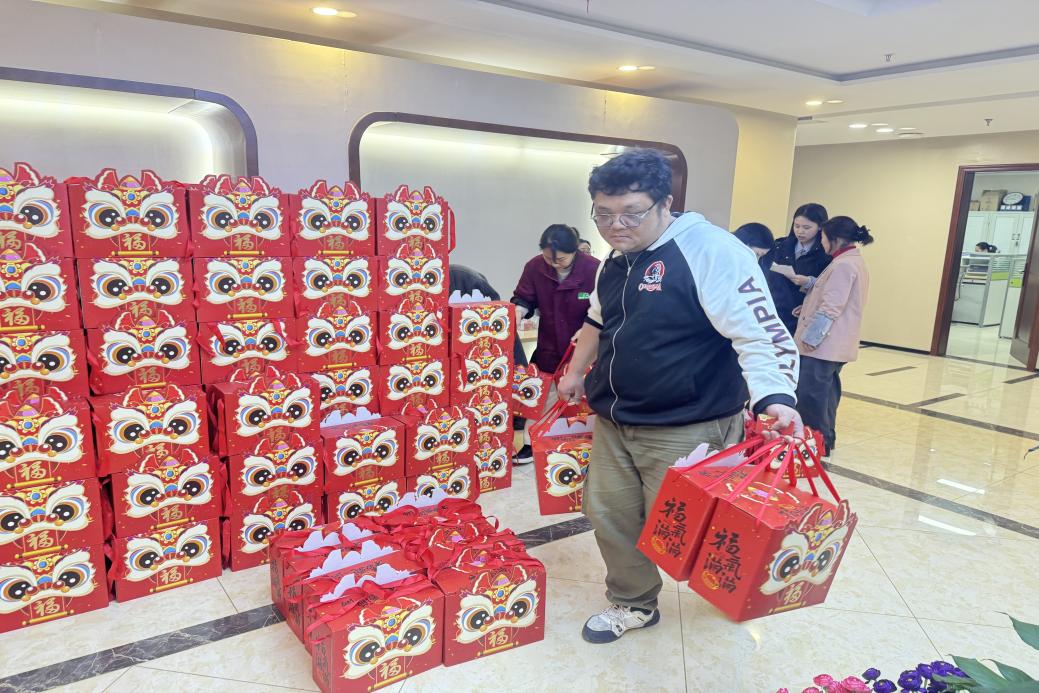過年禮包整齊擺放,福利發放現場熱火朝天,職工們的喜悅之情溢于言表,每個人臉上都綻放著笑容。一份份承載著公司關懷的福利品送到員工手中,同時也送去了公司對員工們的濃濃關愛和新年祝福。